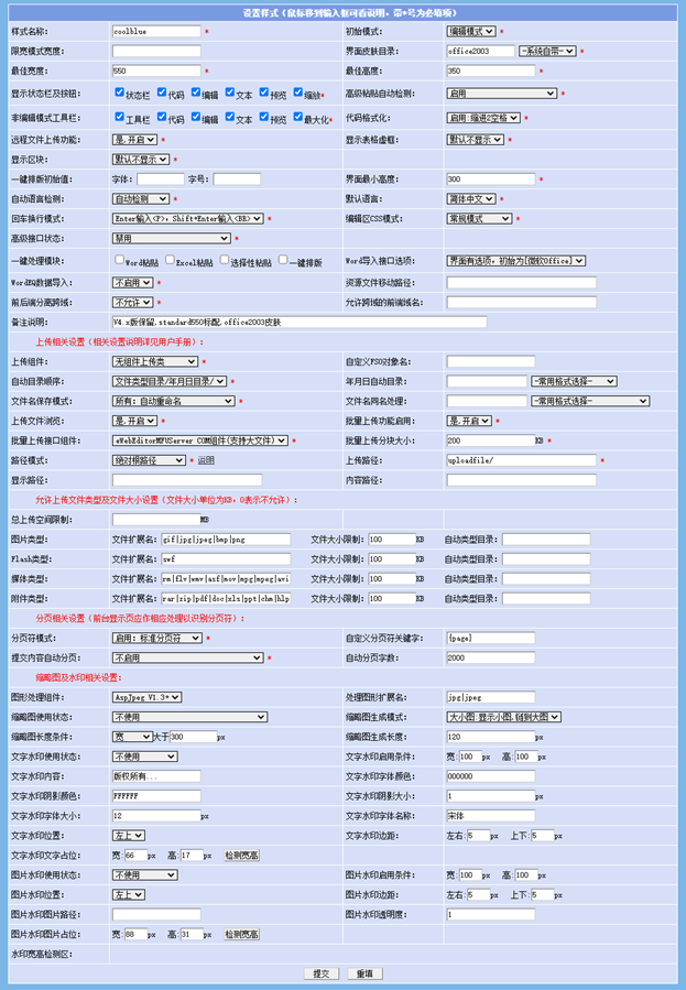指定界面皮肤定义的文件夹名。所有可设的文件夹名在“ewebeditor/skin/”文件夹中。可以从其后的下拉框中选择系统自带的皮肤。
